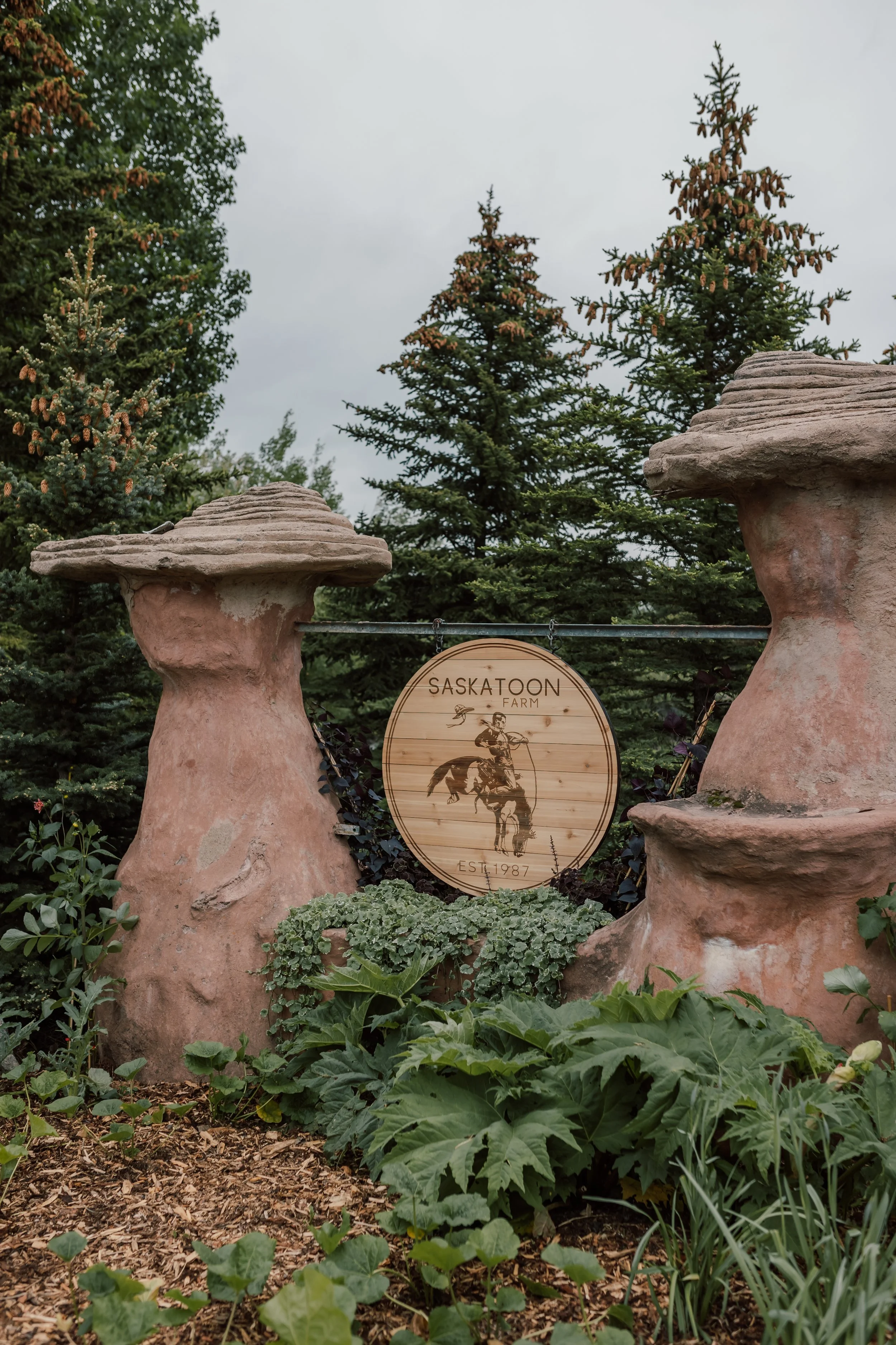 Made in 1967 for Canada’s Centennial, this pole travelled from the Pacific Northwest Coast to southern British Columbia before finding a home at The Saskatoon Farm. It once reached 84 feet but was lowered in 2005 after heavy winds. Pieces of it are now displayed near the farm’s entrance and by the cliff.