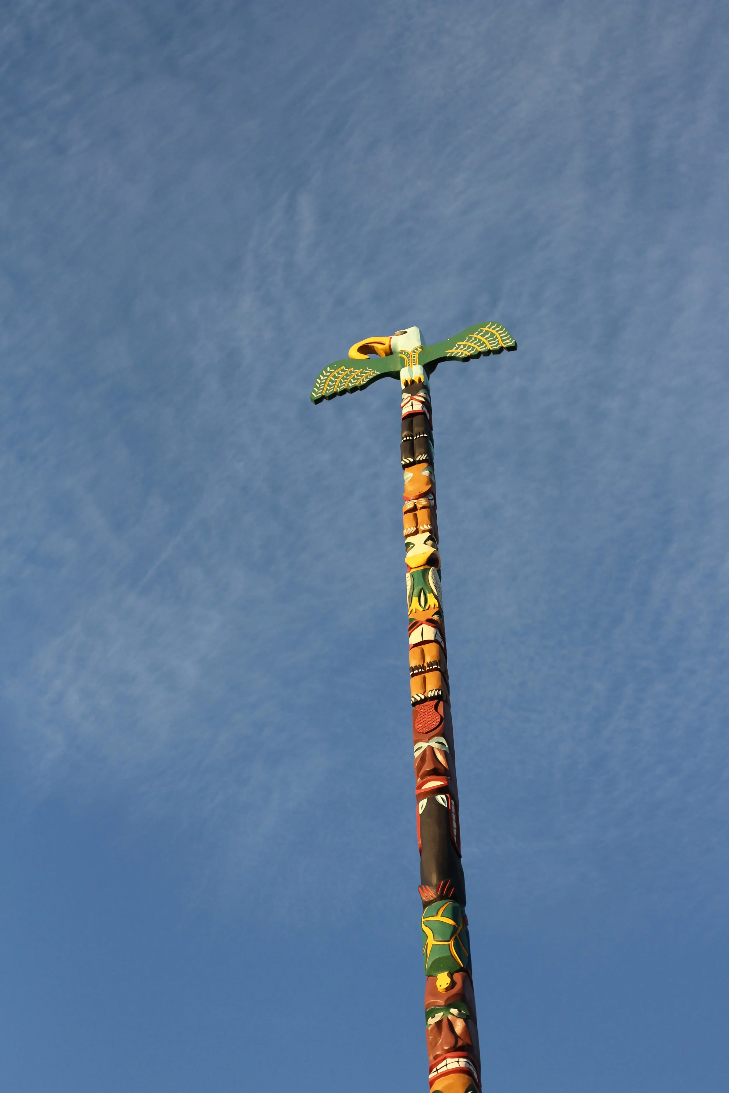 A totem pole is a tall structure created by Northwest Coast Indigenous peoples to showcase a nation’s, family’s, or individual’s history, and display their rights to territories, songs, dances, and culture. The word "totem" comes from the Algonquian word odoodem, meaning "his kinship group" (family or clan).